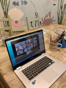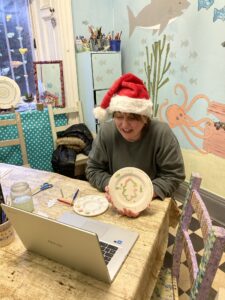 After several months of training and support (face-to-face when possible, plus via telephone) November saw us entering Zoom world – what an achievement! Our first Zoom meeting was hosted by Sharing a Story CIC, when we were joined by author and poet Stuart Paterson. Celebrating Book Week Scotland, we had a wonderful session and also enjoyed some very fine cupcakes! There then followed some fun sessions making Christmas cards, painting Christmas plates and the grand finale for this year, our Christmas Afternoon Tea Party!