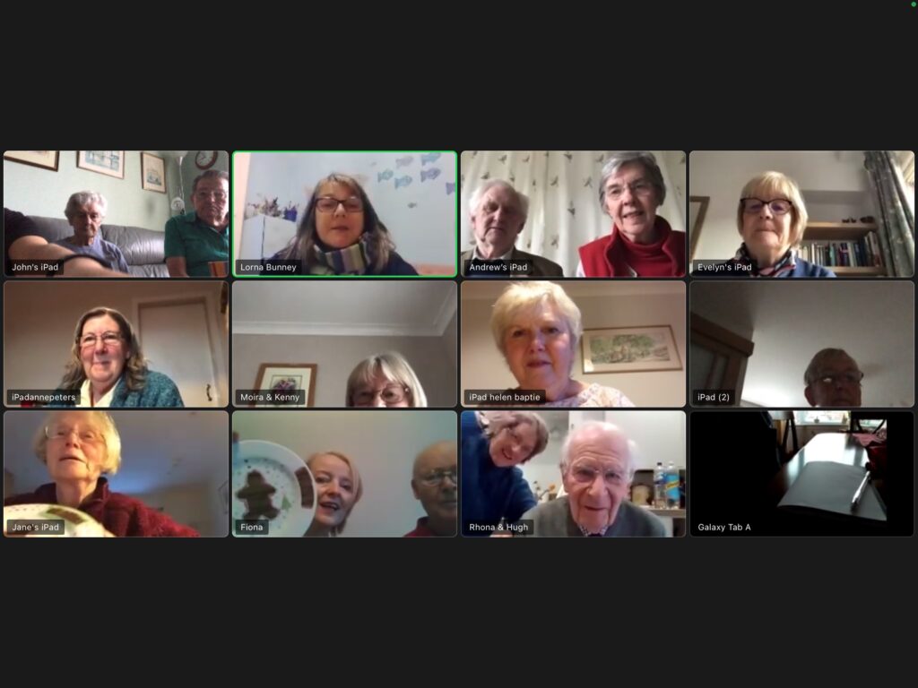 Thanks to Scottish Government funding via the Connecting Scotland initiative, Corra funding and a generous donation from Community Windpower/BeGreen and The Life Changes Trust, ipad and Zoom training was rolled out to our members, which enabled us to hold weekly Zoom meetings. Since our regular face to face meetings were reintroduced in June 21 (now one large group) we have continued to hold regular Zoom sessions (Tuesday afternoons) which have enabled our group members to retain their valuable IT skills.